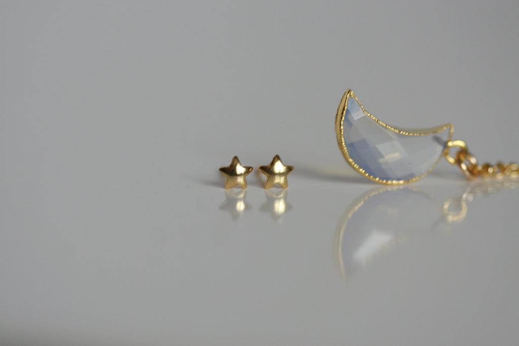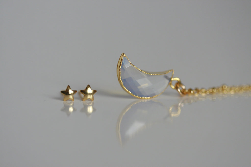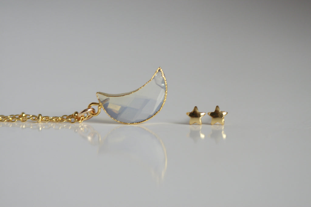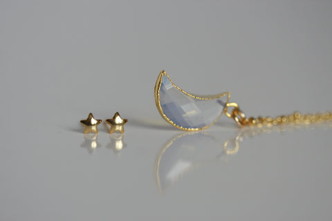 SET of Delicate Moonstone Moon Necklace and Star Stud Earrings